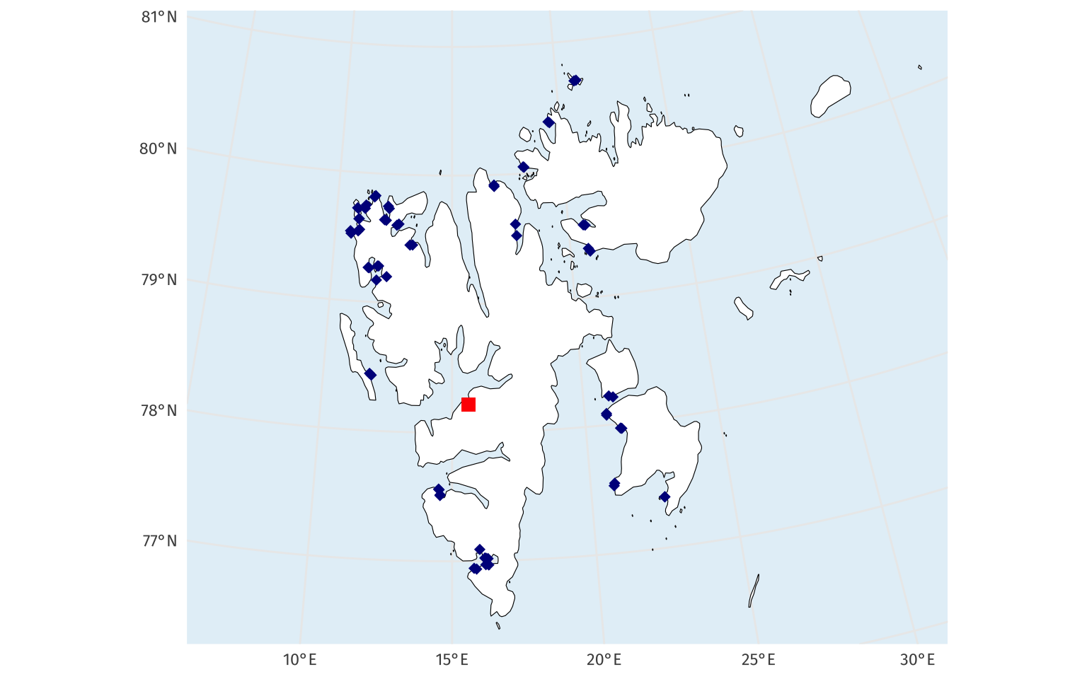Here’s another example using the Geodatabase format. Here we can use data on the legal landing sites for organized tourism in Svalbard, downloaded from the Miljødirektoratet (the Norwegian Environmental Agency). We’ll keep it simple. We’ll add a red mark to indicate where Longyearbyen is located to give some reference point for the island.
