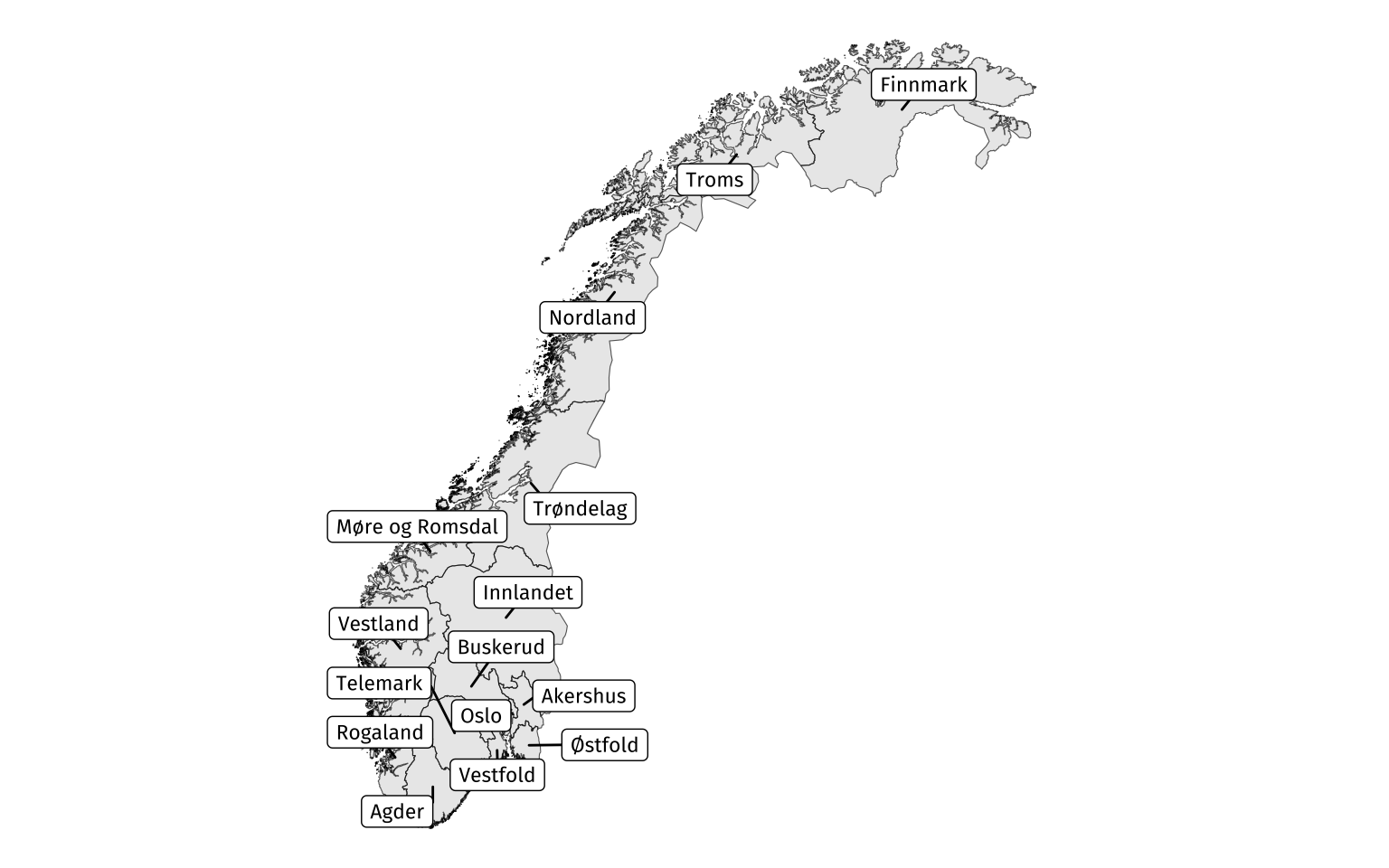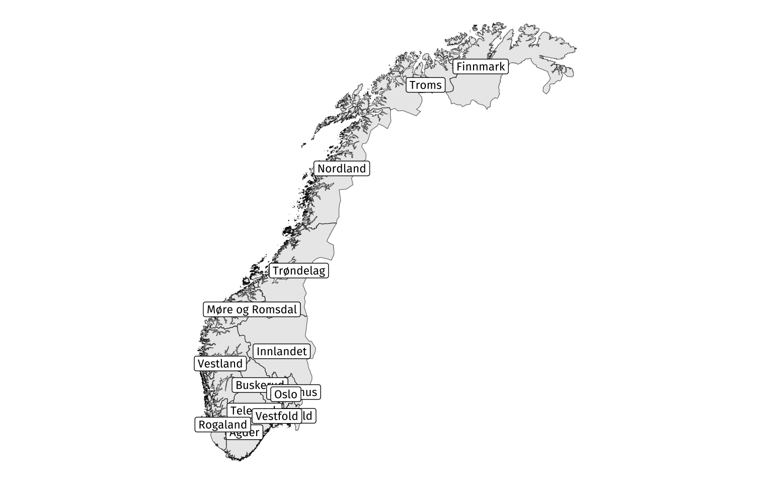 Now the labels are all readable. Oslo is a tiny fylke, so the label almost entirely covers the area on the map, but if we wanted we could finetune the label positioning some more. But aesthetics is not the main goal for today.