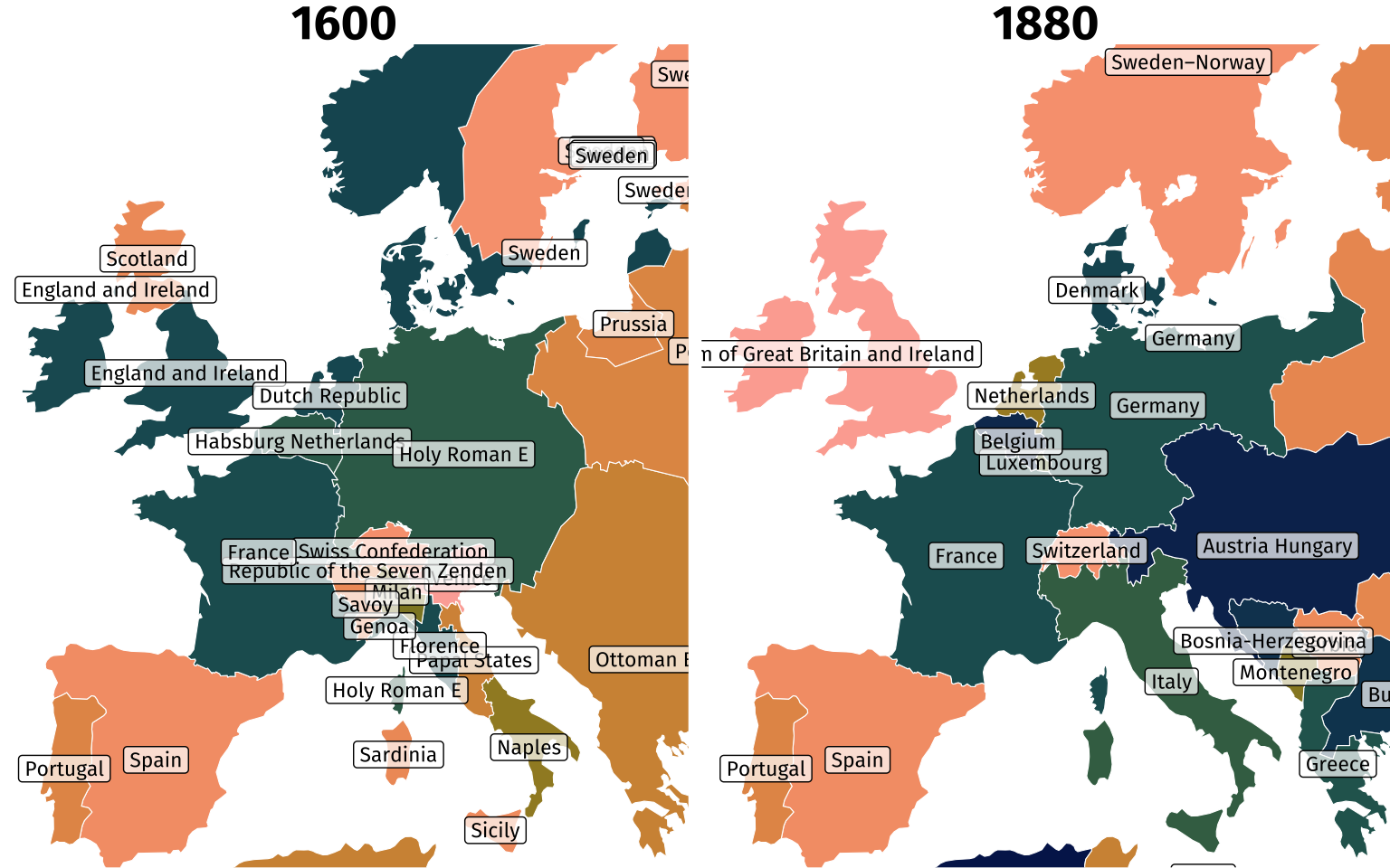 Let’s do another one. Let’s load some GeoJSON files and create a plot. I found a GitHub repository from a writer, cartographer, and data scientist (André Ourednik) that created a bunch of maps from different time periods stored in GeoJSON files. We can read two of these files in and compare what the borders looked like at different times. Since the original maps are world maps, we want to restrict what we show in the plot so we want to restrict the boundaries of what is shown. For this we can use the coord_sf() function and specify the longitude and latitude of the boundaries.