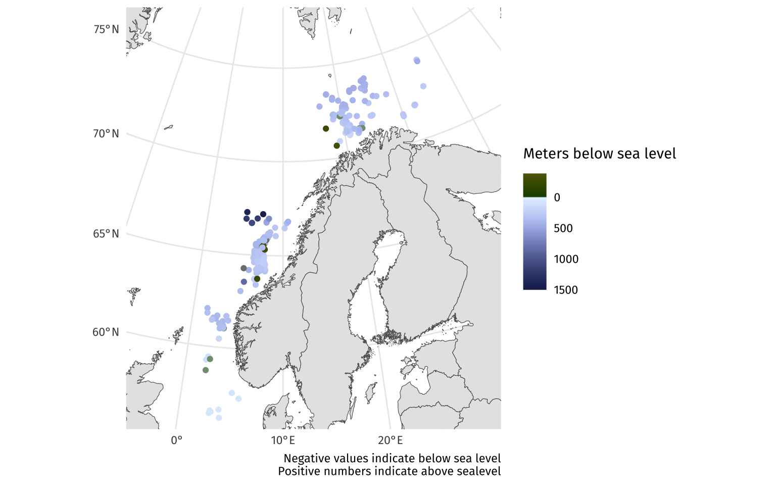 Just to illustrate, this is what the data looks like when plotted. Pay attention to all the little dots scattered around the map. Also note how the entirety of Svalbard is missing, much of which is covered by national parks. However, for now we’ll focus on cleaning the little dots.
