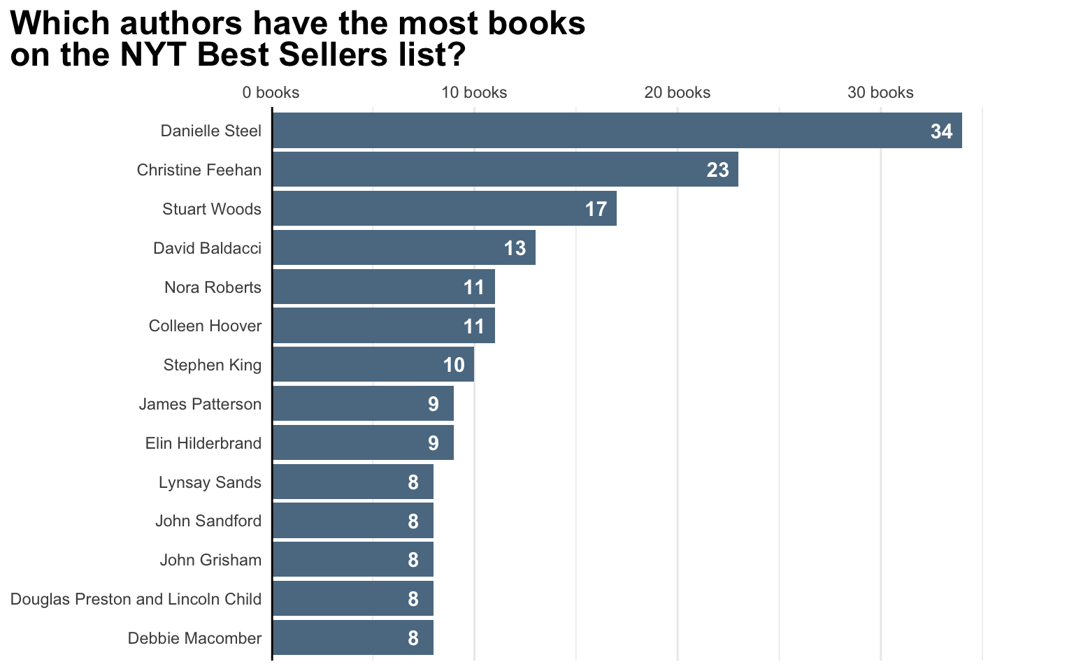 title = "Which authors have the most books<br>on the NYT Best Sellers list?",
