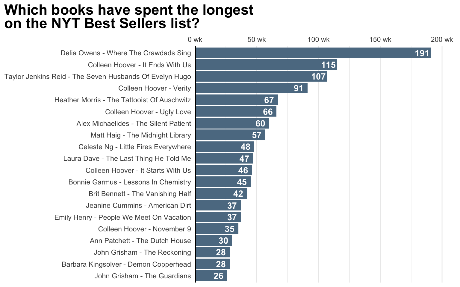 This genuinely surprised me, I had expected some authors to have maybe 6 or 7 books on the list, but it turns out there are some really prolific authors out there, with Danielle Steel definitely taking the top spot. According to her separate (!) bibliography page on Wikipedia she publishes several books a year to make a total of 190 published books, including 141 novels. Wikipedia also mentions a “resounding lack of critical acclaim” The LA Review of Books even used the term “supermarket schlock” , which just emphasizes the point that the New York Times Best Sellers list is not necessarily a mark of quality, but rather of popularity, although one would hope good books are also the books that sell well. Note that some authors have received critical acclaim and have published multiple popular books such as Colleen Hoover and Stephen King in the plot above.