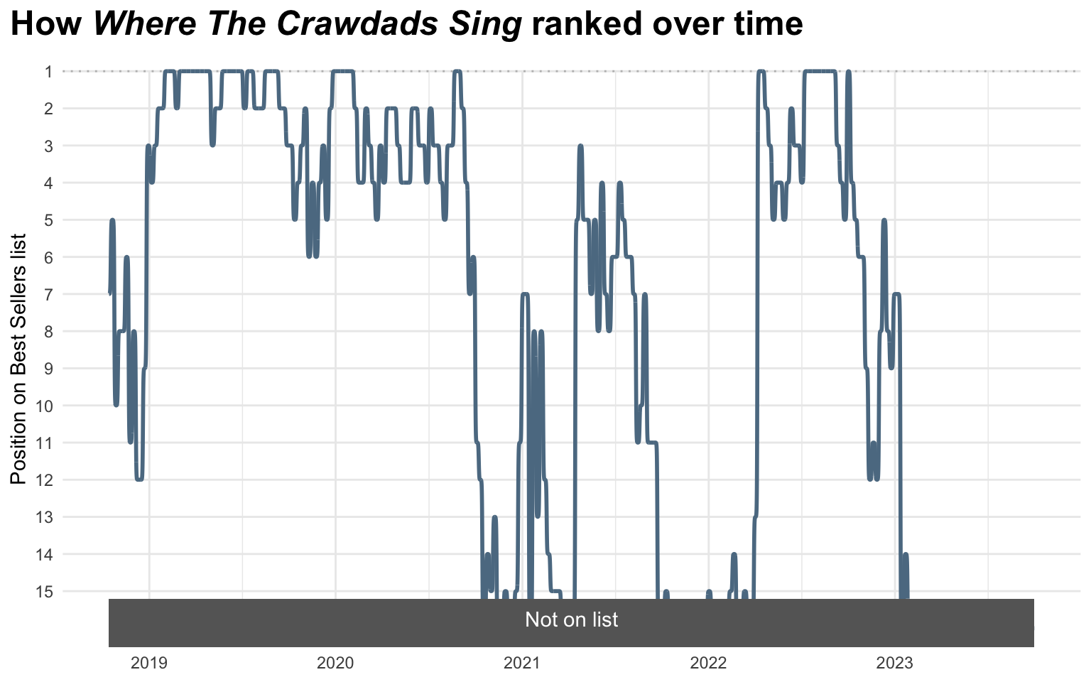 Since we have essentially time series data, we could also plot the trajectory of a book. So let’s take the book that spent the longest on the Best Sellers list in our timeframe: Where The Crawdads Sing. We can plot rank on the list over time. We’ll use the geom_bump() function from the {ggbump} package to get a nicer-looking curve. Since geom_path() and geom_bump() will show a continuous line for missing values and dropping those empty values looks ugly, we’ll hide the weeks where the book wasn’t on the Best Sellers list in an area below the plot.