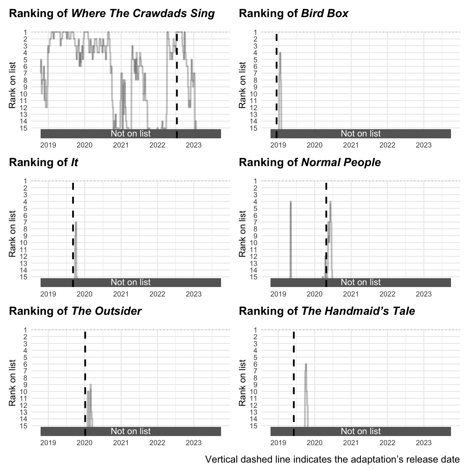 The jump in the plot above that happens in 2022 seemed very remarkable, jumping from spot 13 to 1 within a week. I was wondering if that had anything to do with the release of the movie adaptation. So let’s have a look. The movie was released on July 15th, 2022. Let’s also look at a few other books I know were on the Best Sellers list that have gotten an adaptation. This is just anecdotal and hand-picked evidence of course so needs to be taken with a grain of salt. Perhaps another time I’ll find a more systematic way of testing this. In addition to Where The Crawdads Sing, I’ve picked two other movies and three TV series. The other two movies are Bird Box released in late 2018 and It Chapter Two, the second installment of the adaptation of It by Stephen King. For the TV series I’ll look at the wonderful Normal People based on the novel by Sally Rooney Sally Rooney actually has writing credits on the series too! , initially released in 2020, The Outsider also based on a book by Stephen King, and The Handmaid’s Tale based on the book by Margaret Atwood. In the plots below the vertical dashed line indicates the release date of the adaptation.