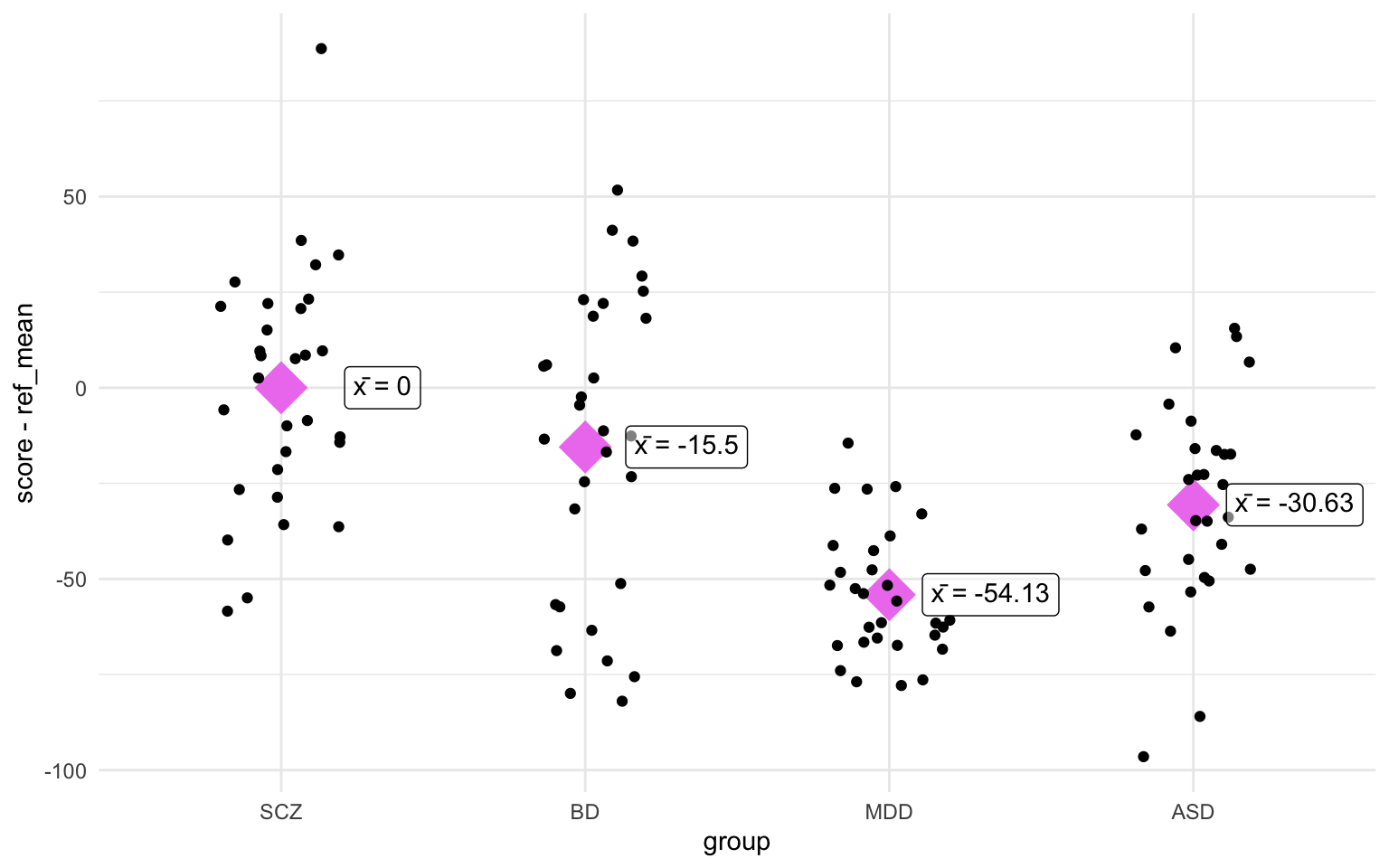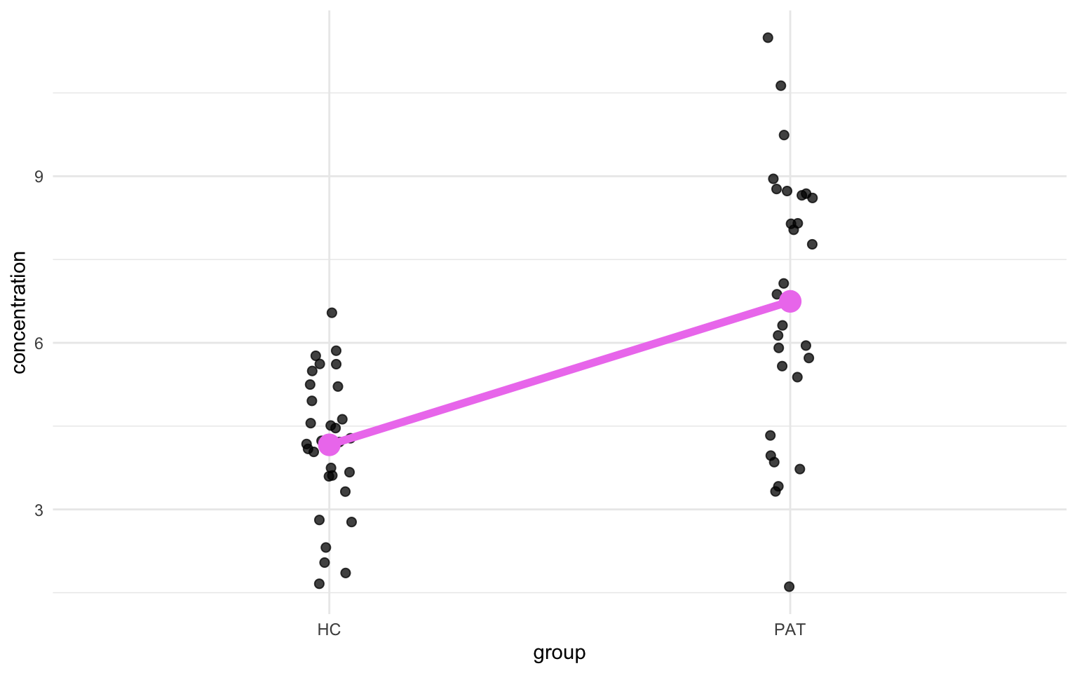 Great! Now we have a visual representation of the data. Now, since the T-test compares means, we can might also add a point indicating the mean for both groups. Let’s look just at the jittered points and add a line connecting the two mean values.