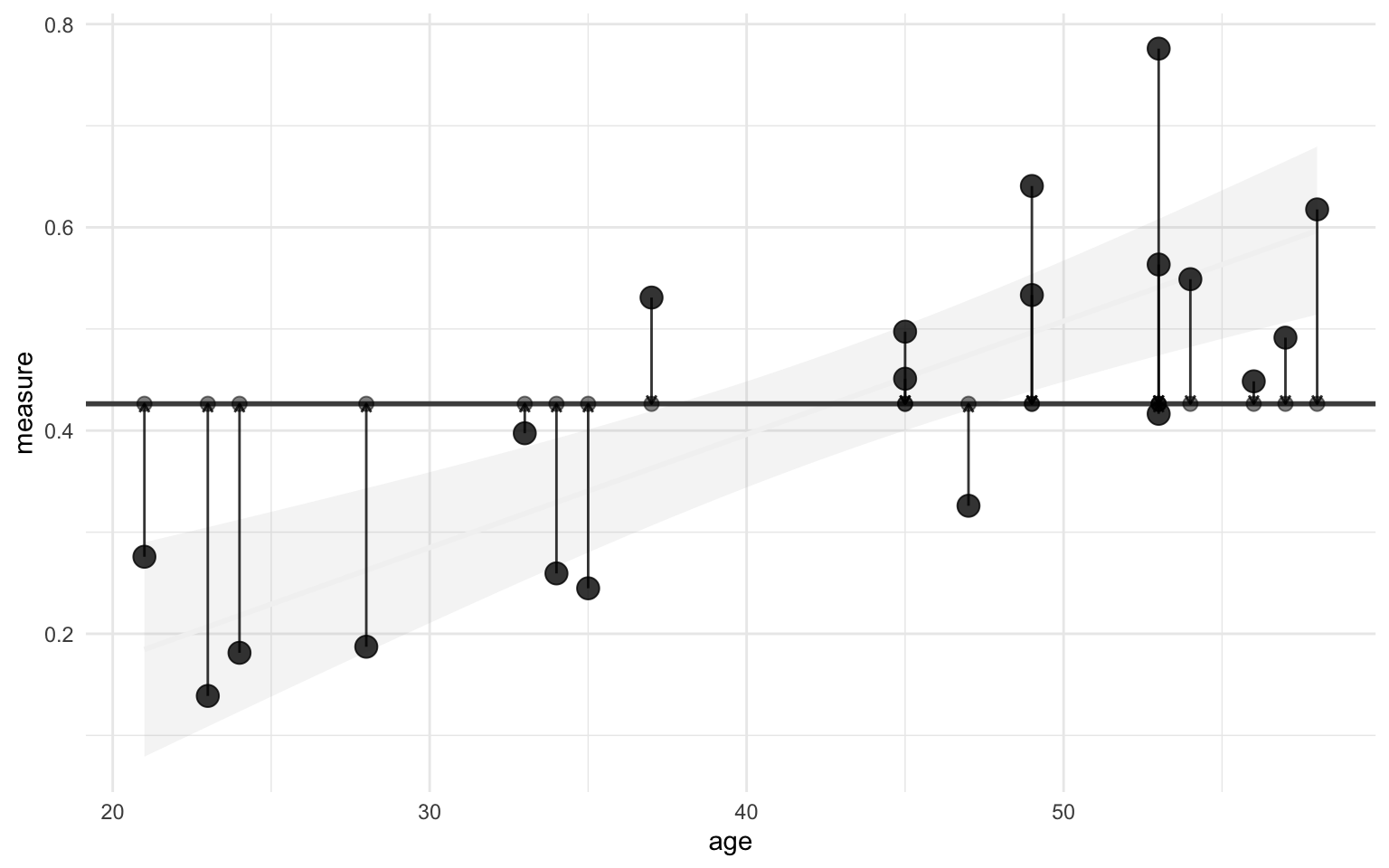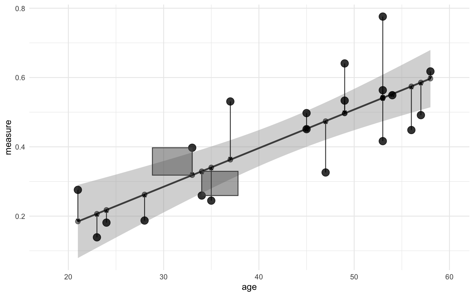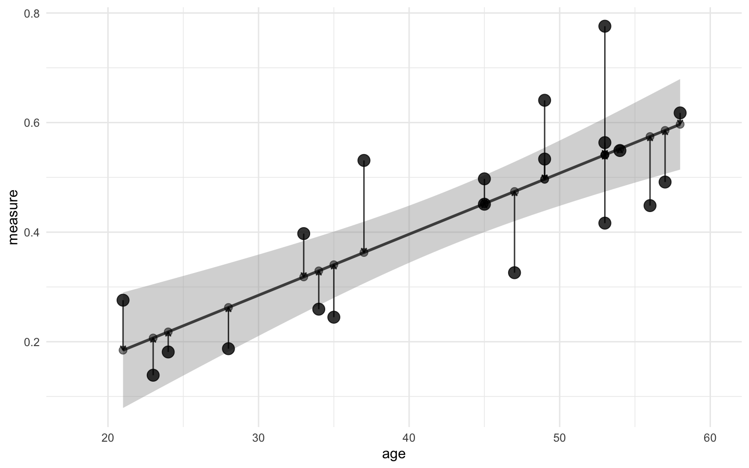 geom_segment(aes(xend = age, y = measure, yend = measure_pred),