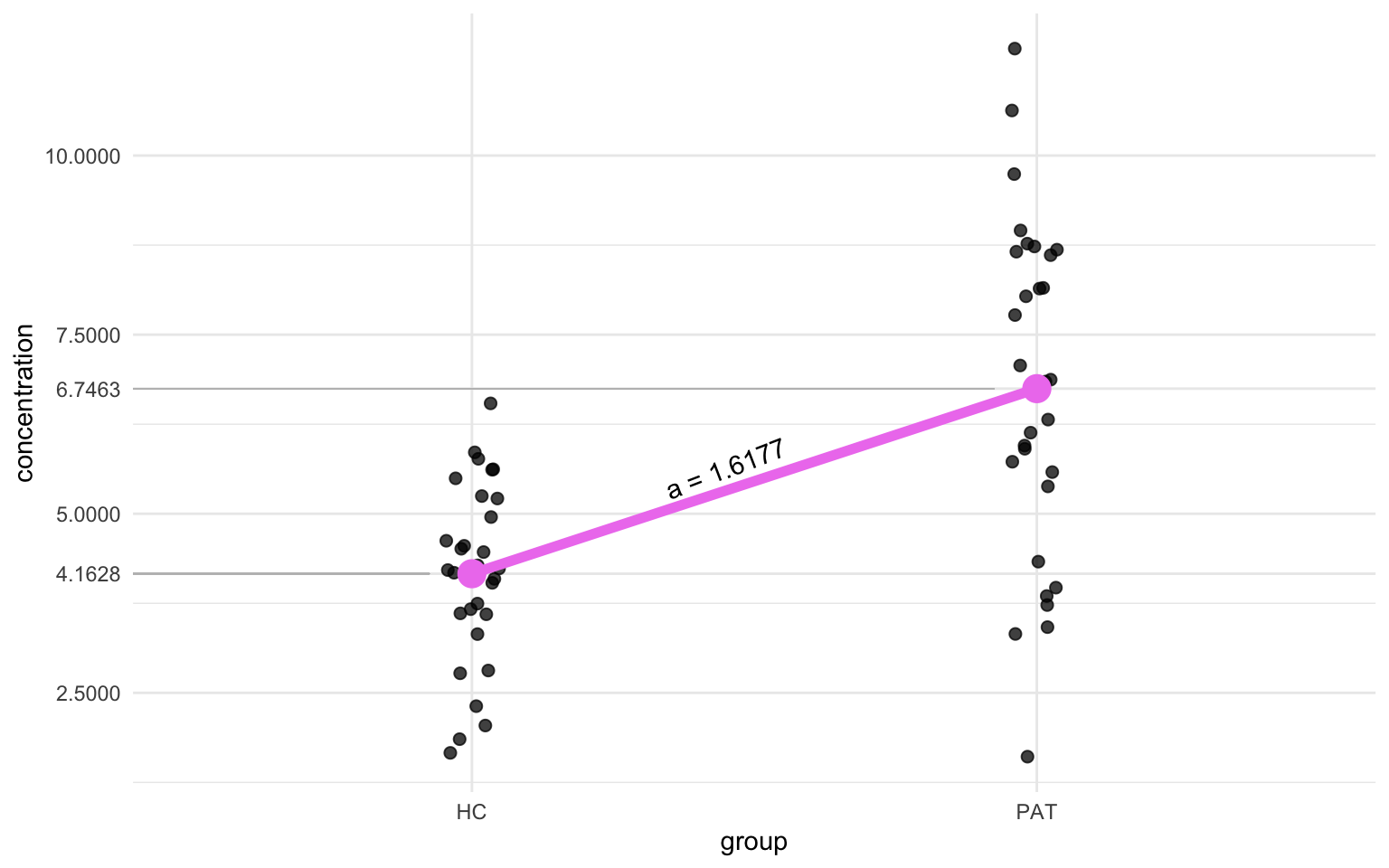 Now we can compare this to the t.test() function and then we’d find the same $t$-value (barring some rounding and digit cutoffs). In this function, since we’re not comparing two samples, we set the population mean (mu) we want to compare to as the reference concentration (the default value for a One-Sample T-test is 0). What the mu option does is nothing else than subtract the reference value from all values. By doing this it centers all the values relative to 0, so if we’d run t.test(concentration - ref_concentration), we’d get the same result, obviously with a different mean and the values of the confidence interval have changed, although the range stays the same.
