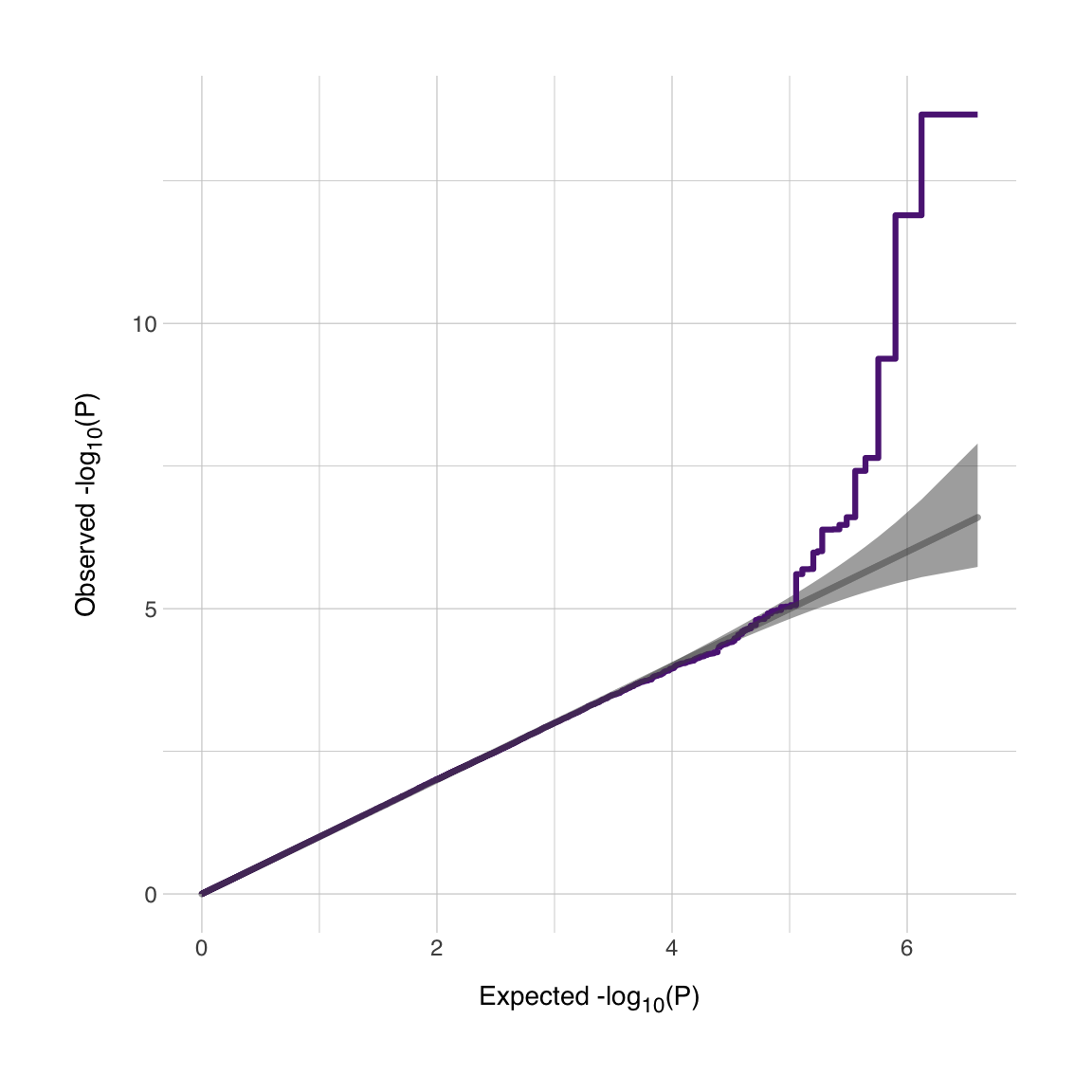 Let’s make a plot! We want the expected values on the x-axis, and the observed values on the y-axis. Then I’ll make a geom_ribbon() layer with the upper and lower bounds of the confidence interval. Now, there’s a few options. Some people prefer to see individual points (with geom_point()), but if you have a million SNPs, I don’t think this always makes much sense. You can also use geom_line(), but I especially prefer geom_step(). This function creates a line between the dots in a stepwise manner, so strictly speaking there are no diagonal lines (but with many points in a region, it may look like a diagonal line). There’s two options for the direction of the geom_step() function, to go from a point to the next first in vertical direction and then horizontal direction is "vh", the other way around is denoted by "hv". What is most suitable for your plot depends on what you want to look at. I’d recommend to be conservative, so if you’re trying to assess inflation, go for "vh", which will visually bias the curve upwards. If you’re looking only at the quality of genetic signal in your GWAS, then go for "hv", since that will visually bias the curve to be closer to the null line. If you’re not sure, then just go for geom_line().