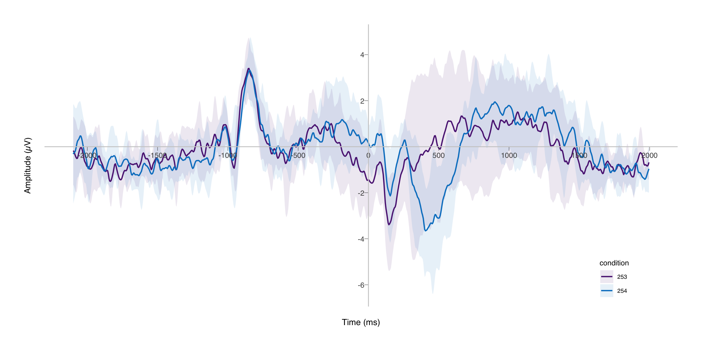 Plotting ERPs is one of the essential skills in EEG neuroscience. There are many possible ways of going about this task, some better than others. Myself, I use either MATLAB or R to plot ERPs. In my experience, MATLAB is by far the preferred method since most of the EEG analysis takes place in MATLAB already, but I believe that there’s some merit to using R. One of my main arguments is aesthetics. Using for instance the {ggplot2} package for the ERP adds a more unified look if you’re using ggplot for the rest of the visualizations of the statistics as well. Another argument could be that it’s easier to add statistical information to the ERP. When I read EEG articles, I find that the ERP plots are sometimes difficult to read, and that they don’t supply any information about the statistical error in the grand averaged ERP. Of course, I have my own code for plotting grand averaged ERP in MATLAB showing the confidence interval for each ERP too, but I find it easier and prettier in R.
