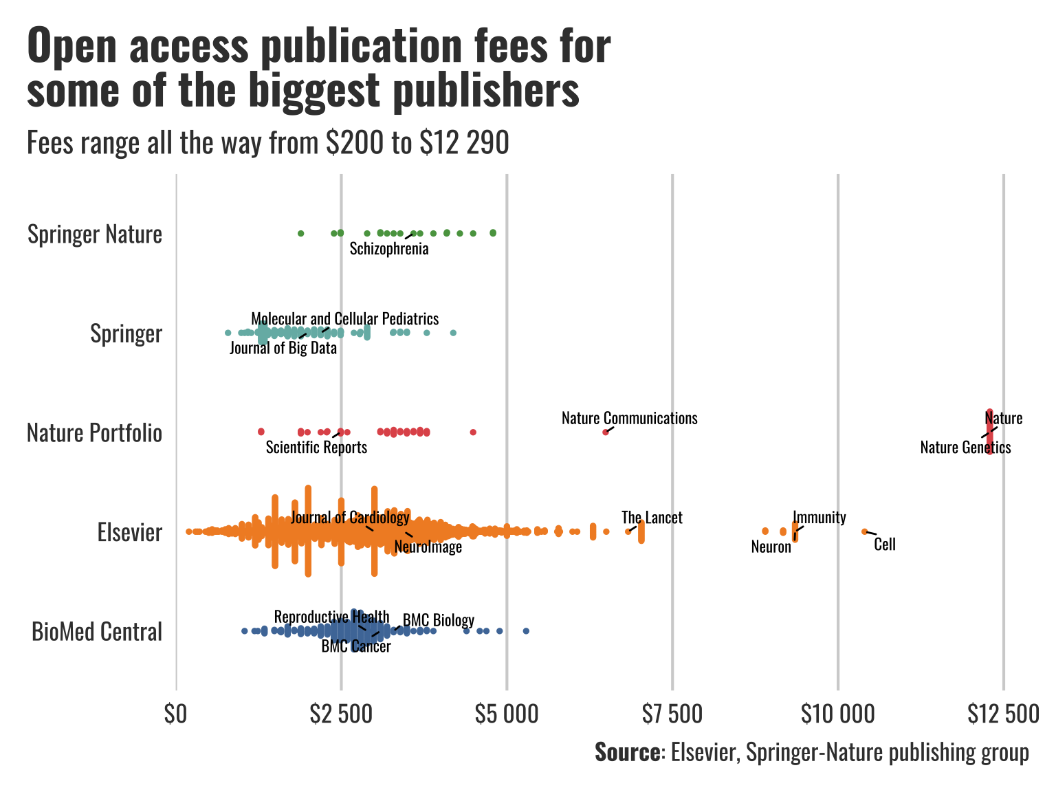 At this point, many people with some knowledge of supply-and-demand forces will feel a tingle in their bones, because scientists are entirely dependent on publications in higher-profile journals for their livelihood. So spots in these journals are in high demand. Since a considerable subset of these scientists need to make their articles open access and the publisher cannot include these articles in the subscriptions they sell, the publishers found that they can demand higher-and-higher compensation for publication in these high-profile journals. This is the situation we’re at right now. The open access fees (or article processing fees, or APCs) have skyrocketed since publishers found that scientists were willing to pay considerable portions of their grant funding to ensure their articles could be published in high-impact journals so they would ensure continuity for their research and the work of their students and researchers under their supervision.